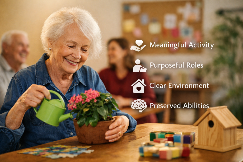 Developed by Dr. Cameron J. Camp, founder of the Center for Applied Research in Dementia (CARD), this approach adapts the principles of Dr. Maria Montessori to support engagement, independence, and meaningful participation for people living with dementia.